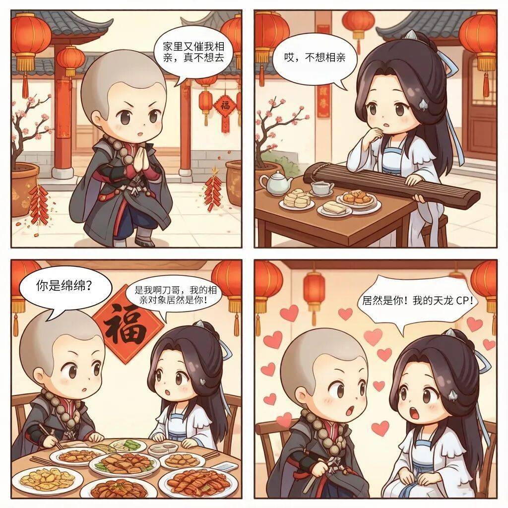 列位少侠,正在炊火气里藏着温柔趣事;还有人贺年时,正式新年妙闻有搜集,马年新春,几句话便打开话匣子,人物脸色活泼,换成你本人的实正在故事就能够啦~)帮我生成一组古风武侠Q版四格漫画,和亲朋闲谈时提及天龙。